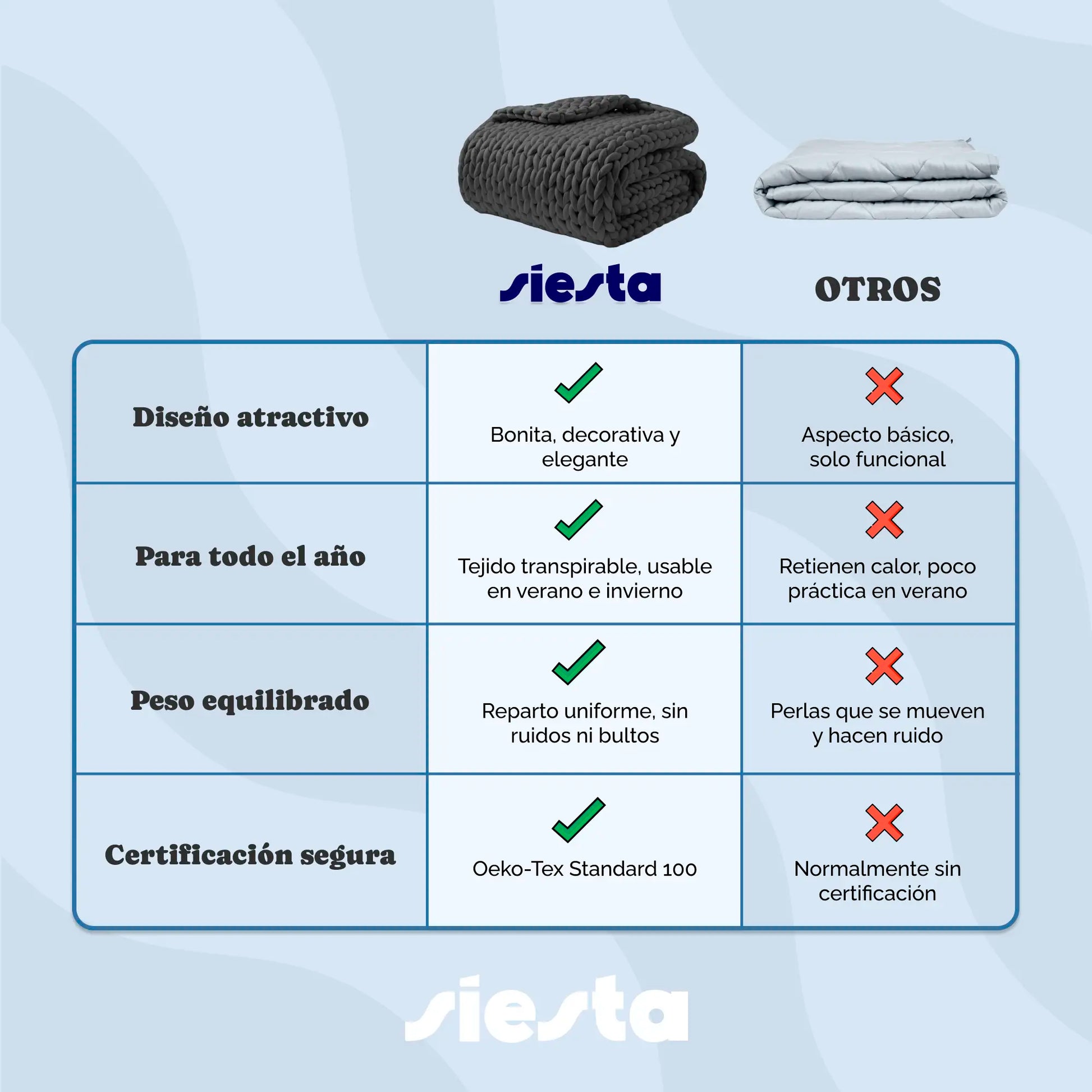 Su peso terapéutico ejerce una suave presión que relaja el cuerpo, reduce el estrés y te ayuda a conciliar el sueño más rápido. Es como recibir un abrazo continuo sin necesidad de pedirlo. 😌
